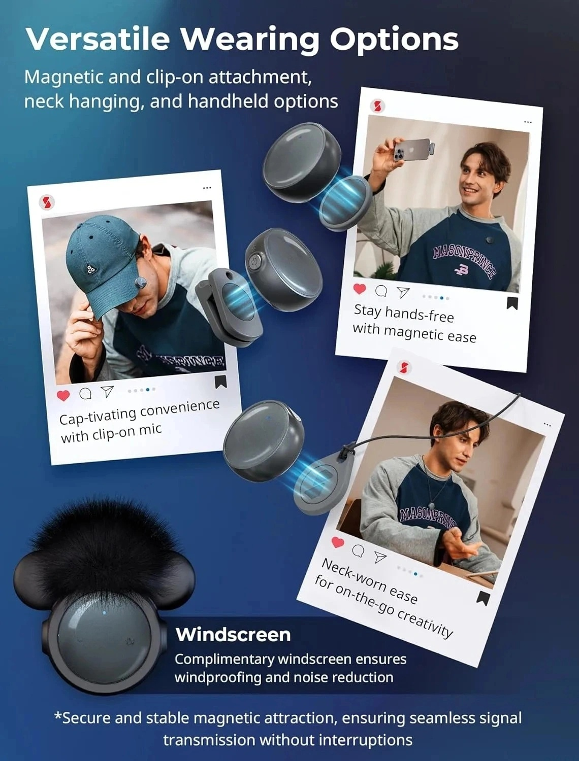 Versatile Wearing Options: Featuring a range of accessories, this microphone offers versatile wearing options such as collar magnetic attachment, neck hanging, handheld, and clip-on styles. Additionally, it supports the use of a windscreen that can be affixed to a silicone mount, providing windproofing and noise reduction benefits